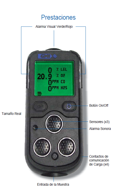 - Alarmas: Alarmas visuales (LED), sonoras (>90 dB) y vibratorias.